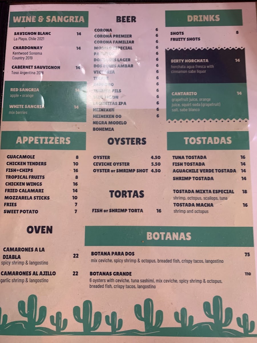 Raw shrimp, cucumber, serrano pepper, avocado, cilantro, onions and green cucumber sauce.