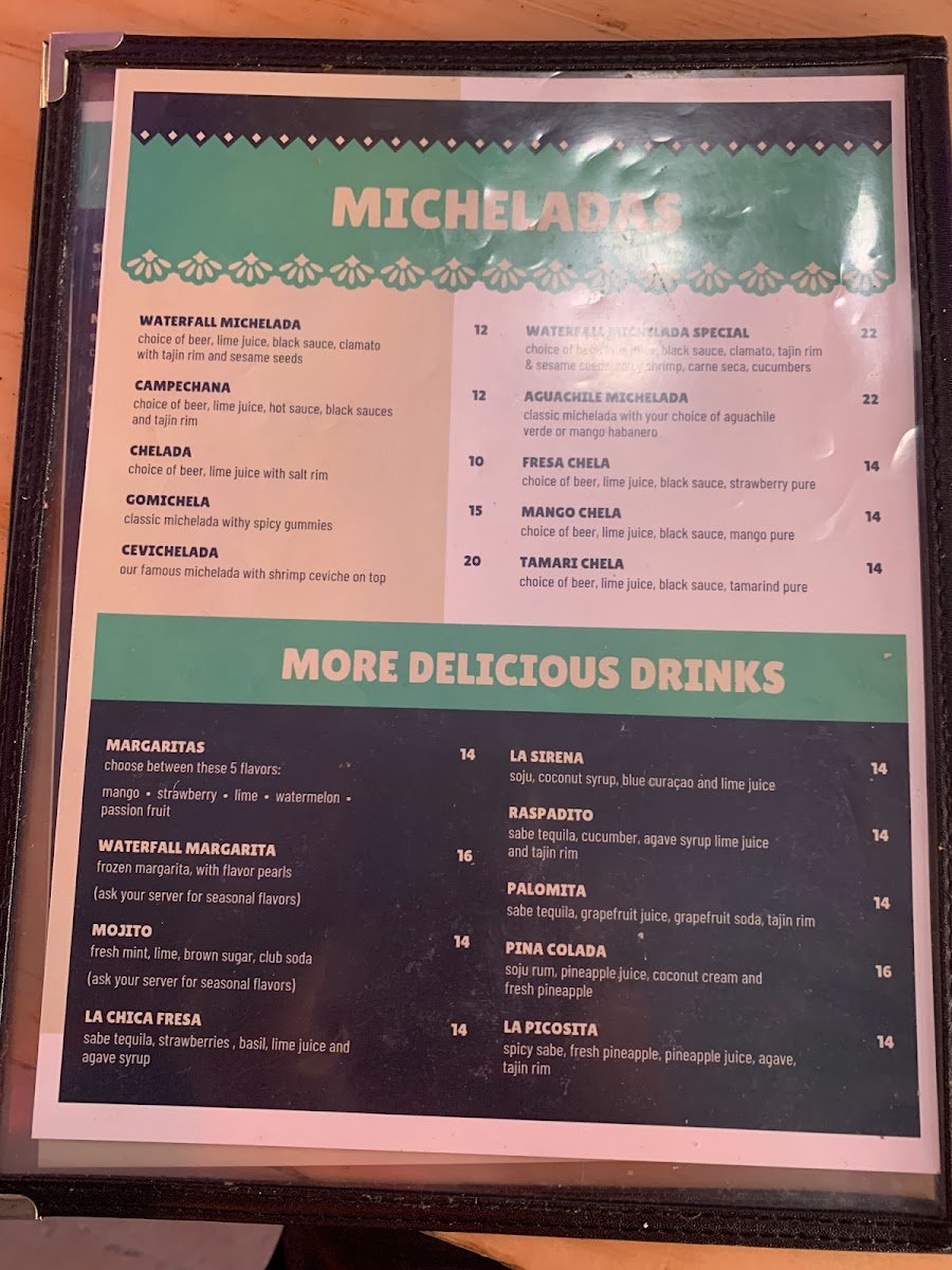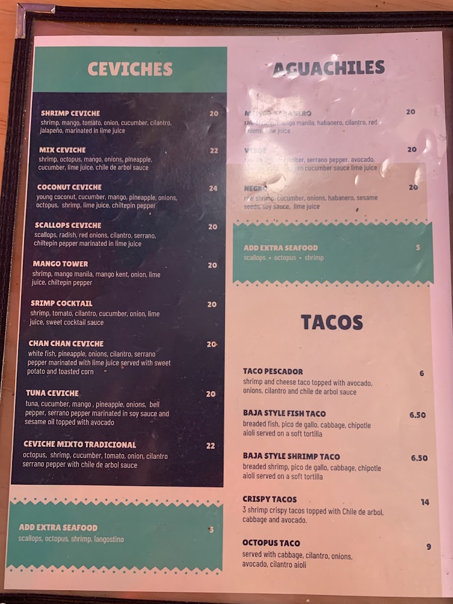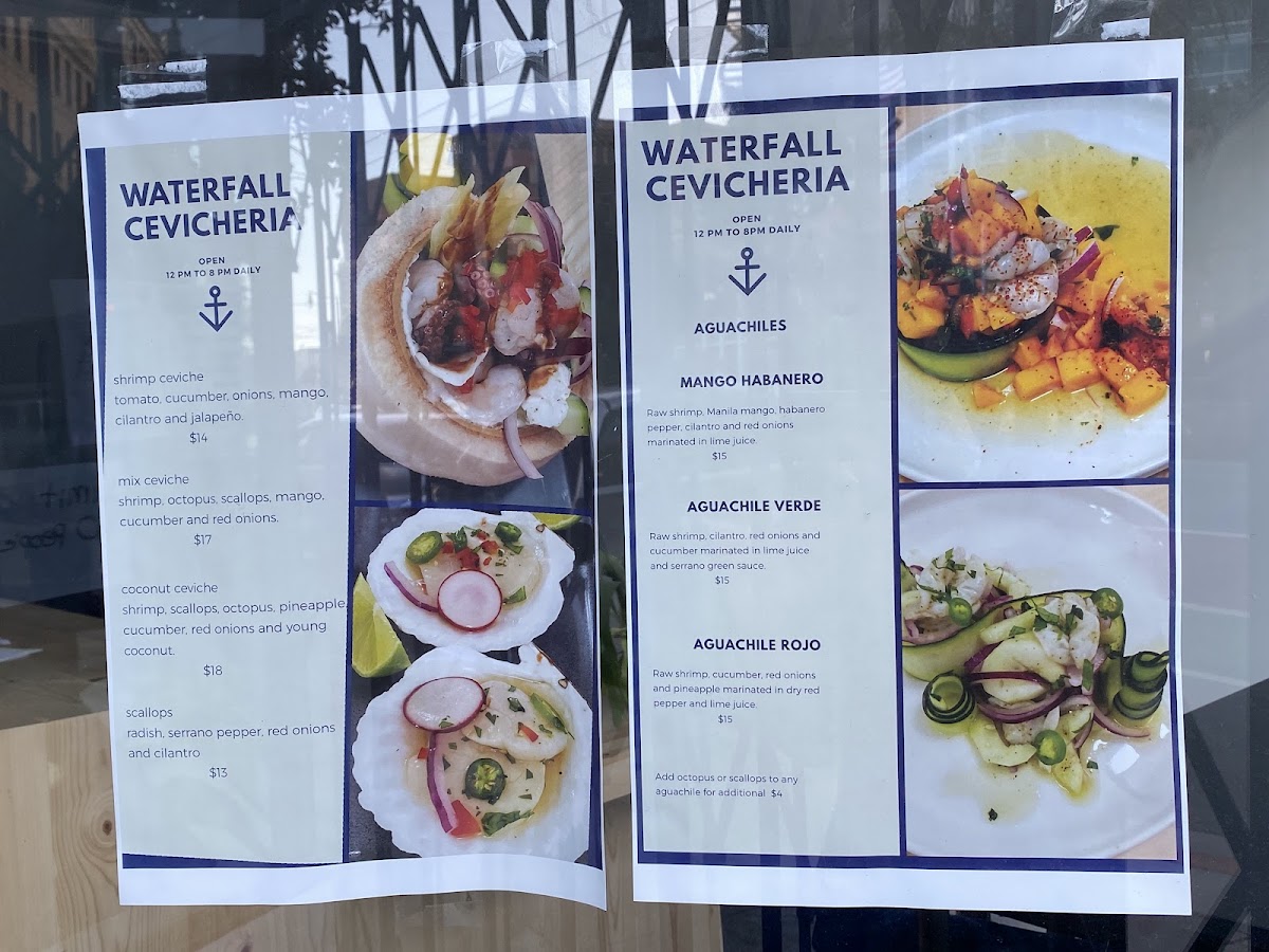 Waterfall Cevicheria offers a vibrant and diverse menu that showcases a fresh take on seafood and Latin flavors. Among the tacos, Crispy Potato Tacos, Baja Fish Taco, and Baja Shrimp Taco stand out, alongside the unique Taco Pescador and Crispy Shrimp Tacos. For a hearty option, the Lunch Box 2 and Lunch Box 1 provide a satisfying combination of dishes. Ceviche lovers will appreciate the refreshing Scallops Ceviche, Tuna Ceviche, and Coconut Ceviche, while the Mix Ceviche and Mango Ceviche bring a delightful burst of tropical flavors. Appetizers like Fruta Variada, Mix Tostada, and Shrimp Tostada are perfect for sharing, and the Fried Calamari and Guacamole add even more variety to the menu. For a lighter bite, Wings, French Fries, and Sweet Potatoes are great snacks, with the indulgent Mozzarella Sticks making for a cheesy treat. The kid-friendly Chicken Tenders, Fish & Chips, and Shrimp & Chips are a hit with younger diners. For something a bit more daring, the Mango Habanero Aguachile, Aguachile Verde, and Aguachile Rojo bring bold heat to the table. Finally, the Mix Tostada (with octopus, shrimp, and scallops), Octopus Tostada, and Shrimp Tostada are an excellent choice for those seeking a flavorful and satisfying bite. Whether you’re after a quick snack, a casual lunch, or a fresh seafood experience, Waterfall Cevicheria offers something to satisfy every craving.